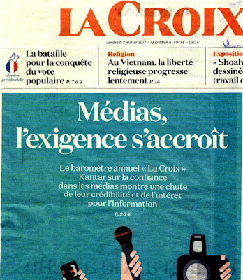 Ce qui m’intrigue, néanmoins, c’est que vous ne sembliez pas pressés de vous appliquer cette analyse à vous-mêmes, comme si vous n’étiez pas concernés par ce désamour. Il me semble que, si j’étais vous - la presse en général et le Quotidien La Croix en particulier -, j’aurais des raisons de m’inquiéter de la chose. C’est, notamment, ce que je me suis dit en consultant votre site Internet il y a peu, et en y découvrant une relation de la présentation par Marine Le Pen de son programme présidentiel (Lyon, 5 février 2017).