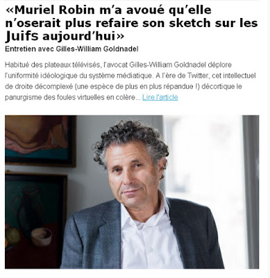 P. S. Tiens donc, voilà autre chose : vous croyez peut-être que j'écris des articles sur ce blog juste pour me défouler ou pour perdre mon temps avec des cuistres ? Vous vous trompez lourdement ! Suivez, donc, le lien qui vient, pour vous persuader que ce brave avocat, qui ne travaille pas beaucoup, est aussi un affabulateur de première, lorsqu'il prétend avoir reçu une confidence de Muriel Robin, alors que, dans les faits, Muriel Robin s'est confiée à une radio (septembre 2018)... Par parenthèse, Robin affirme dans l'interview qu'elle ne l'écrirait plus (le sketch) parce que (elle ne le sait pas très bien elle-même)..., et ce d'autant plus que personne ne lui a jamais tenu rigueur pour ce sketch - à peu près inconnu au bataillon -, qu'elle prétend pouvoir rejouer sur scène à tout moment..., et puis, ajoute-t-elle, il passe toujours à la radio... M.D.R. (mort de rire) ! Pauvre Monsieur 'Aiguille-en-or' ! (lien)