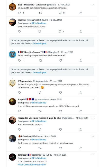 Nous en avons une petite démonstration ci-dessous, avec, pour entamer chaque série, un premier tweet émanant du gourou, suivi de la bouillie redigérée par les gogos (et c'est là qu'il s'avère intéressant de compter le nombre moyen de signes de chaque message), et là, je me dispenserai quasiment de tout commentaire, sinon que le QI du gourou transparaît et se réfléchit fort bien - en miroir - dans celui de ses "disciples". Pour être honnête, je crois que, sur lesdits réseaux sociaux, il y a vraiment matière à rédiger moult essais ou thèses doctorales : en linguistique, sociologie, psychologie individuelle, de masse... Pour ma part, j'y réfléchis sérieusement.
